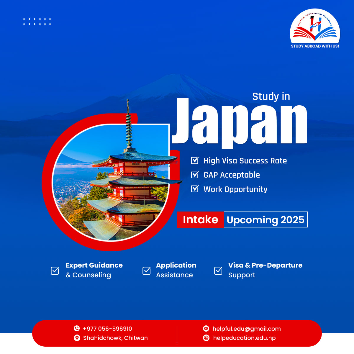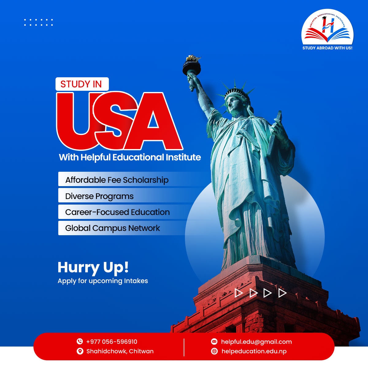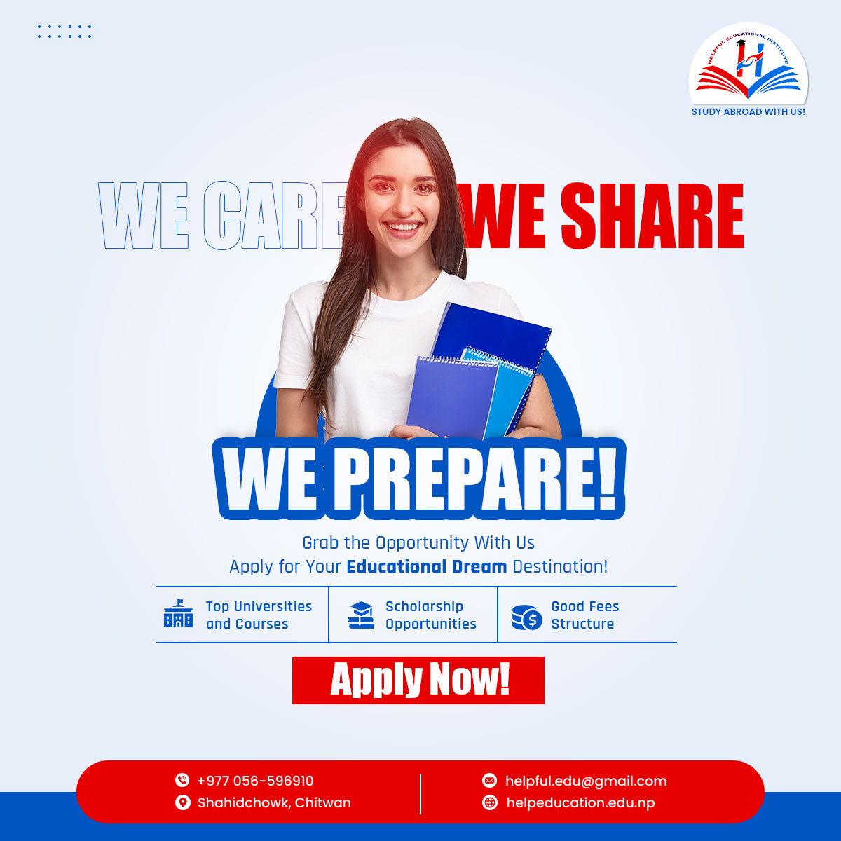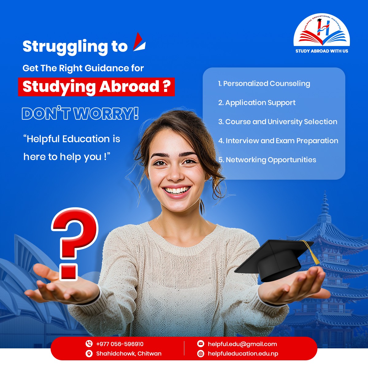Helpful Educational Institute (P) Ltd. is a licensed education consultancy that focuses on overseas education and immigration services. Our dedicated team offers guidance to students planning their higher education abroad. We are situated in Bharatpur, Saheedchowk, Chitwan, Nepal, where we provide access to some of the most prestigious programs affiliated with esteemed universities both locally and internationally. We assist you throughout the entire process, from university or college admissions to successful visa interviews and enrollment at your chosen institution. Our services are customized to meet your specific needs, ensuring that we find the most suitable programs and institutions that align with your budget and qualifications.